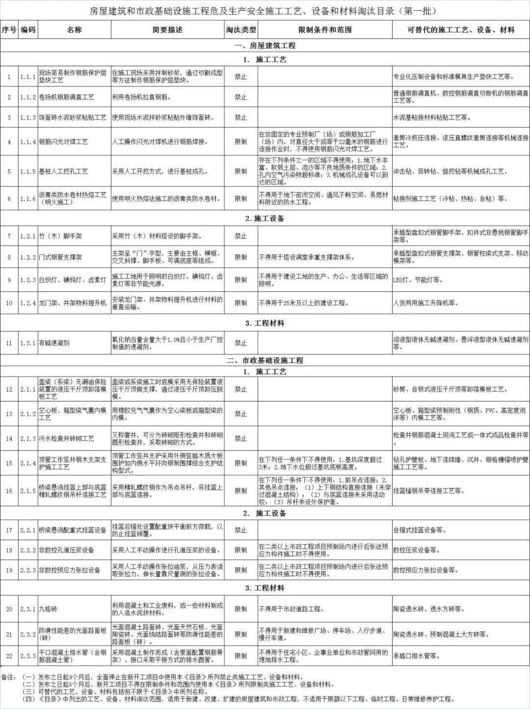 2022年9月15日后,全面停止在新开工项目中使用《目录》所列禁止类施工工艺、设备和材料。